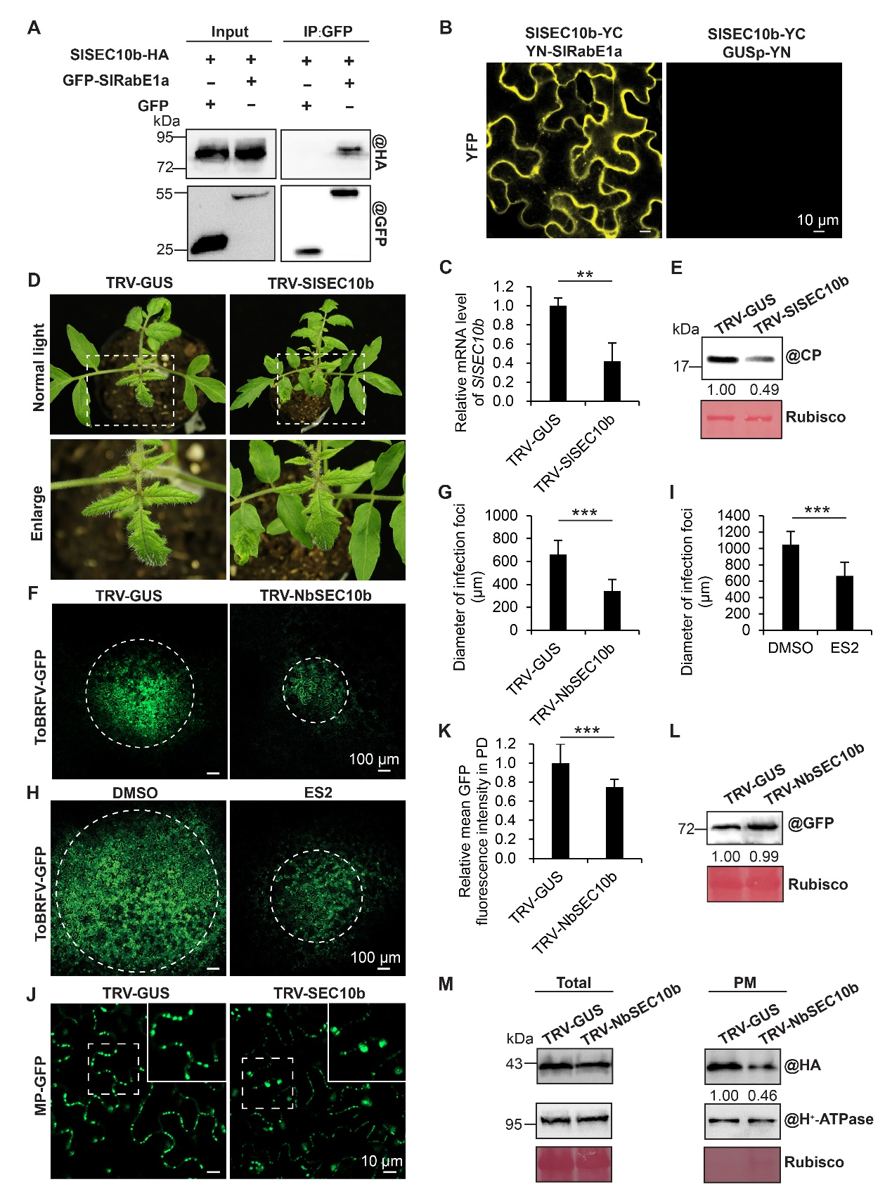 图2. RabE1a与SEC10b相互作用共同调控MP向质膜的转运和ToBRFV细胞间移动。