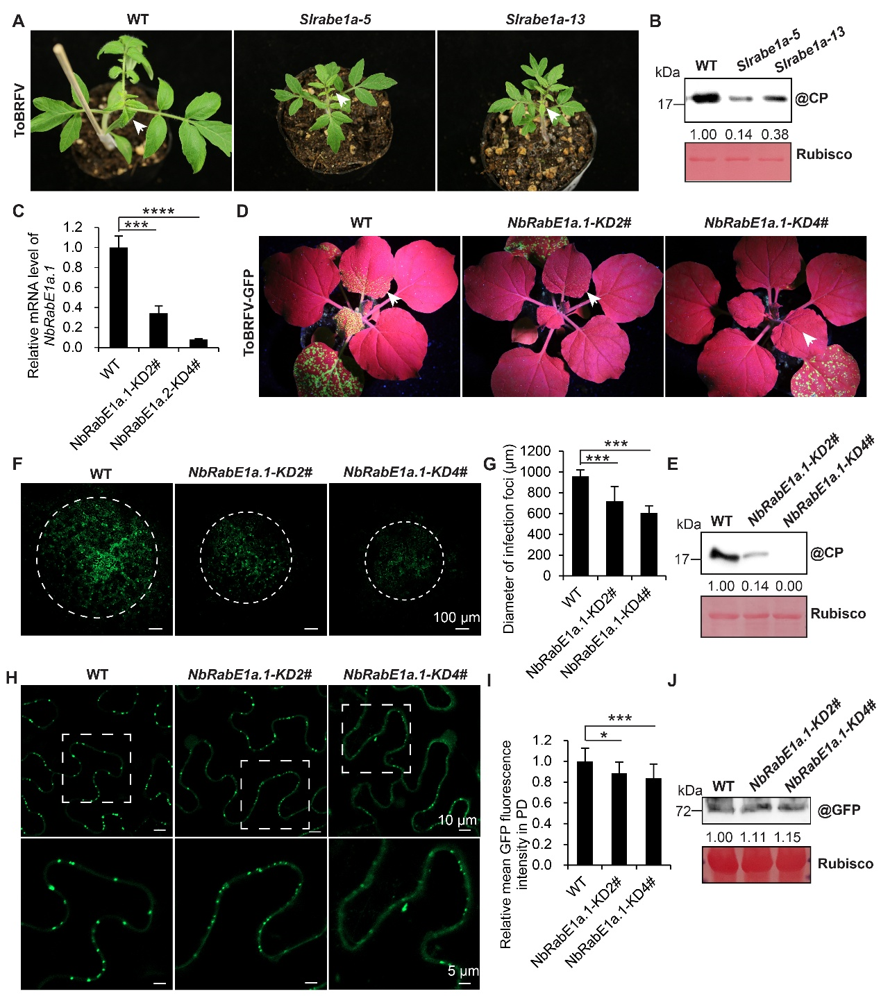 为了确定沉默RabE1a.1是否影响ToBRFV MP的PD定位,研究者在野生型和NbRabE1a.1-KD本氏烟植株的叶片中瞬时表达ToBRFV MP-GFP。在农杆菌浸润后48小时,通过共聚焦显微镜观察浸润区域。结果显示,NbRabE1a.1-KD叶片中MP-GFP的荧光强度低于野生型本氏烟叶片(图1H和1I)。Western blotting结果显示,野生型本氏烟和NbRabE1a.1-KD叶片中MP-GFP的表达水平没有显著差异(图1J)。这些结果表明,RabE1a调控MP向PD的转运,从而影响ToBRFV的细胞间运动。